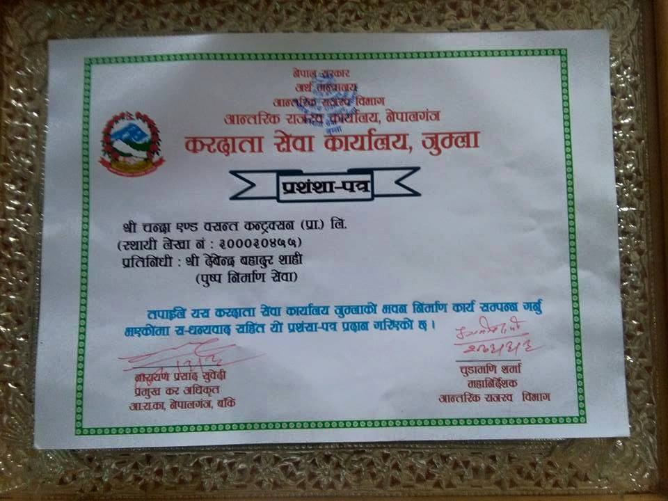 'C.A.B. Construction Pvt. Ltd.' (formerly known as 'Chandra & Basant Construction Pvt. Ltd.') was originally established in 1985 A.D. (2042 B.S.) in the proprietorship of Mrs. Chandra Devi Chand with a sole objective of providing quality construction services in the field of civil engineering and was converted into a private limited in July 1994. Subsequently, it was grown into a class ‘A’ contractor in 1994 A.D. (2050 B.S.) with an expansion of its activities in various development projects within Nepal. Now it has surfaced as one of the pioneer companies in Nepal.